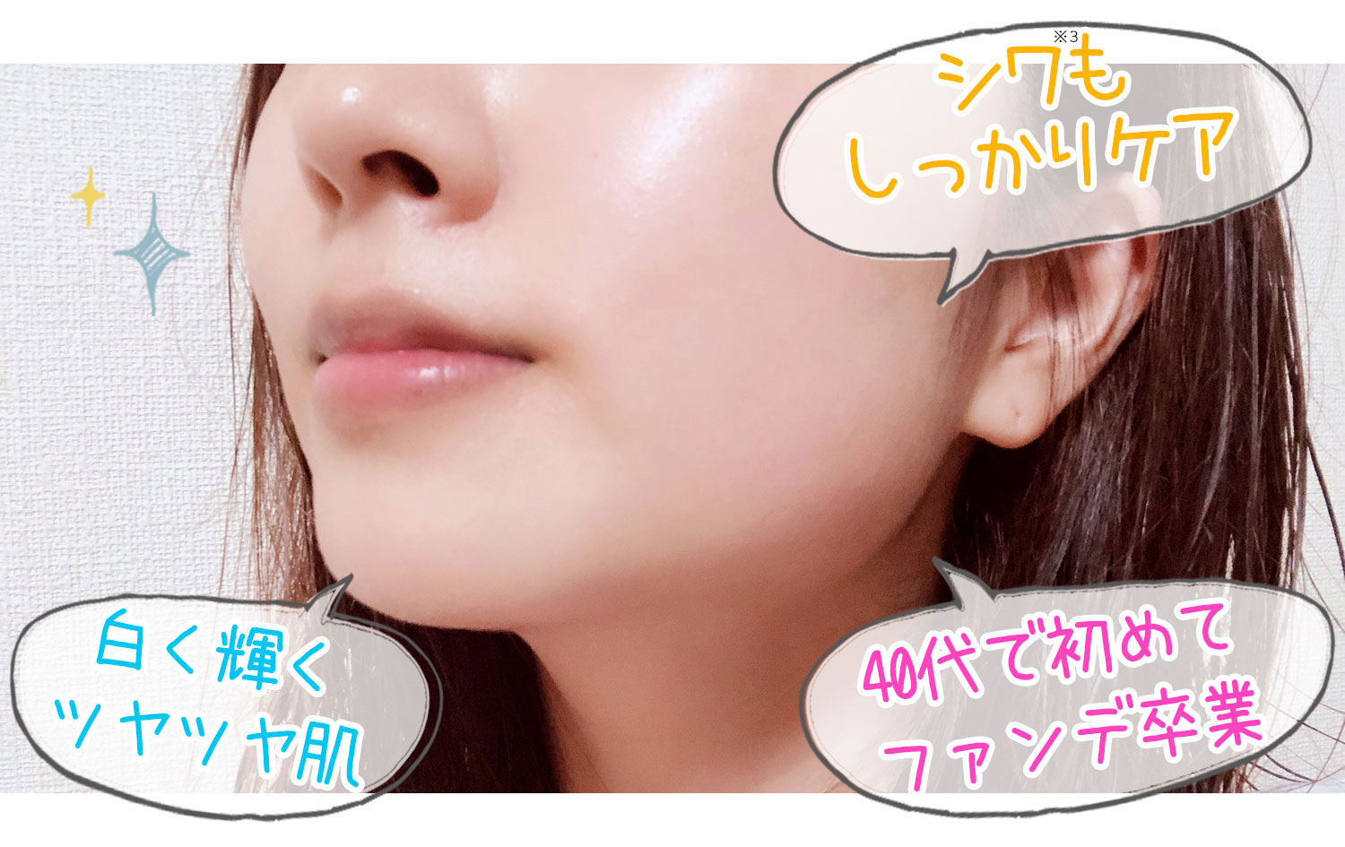 なんの成分が入っているかってすごく大切なんですね。スキンケアをカナデルに変えてからドアップの写真も怖くありません!これからもずっと使い続けます。